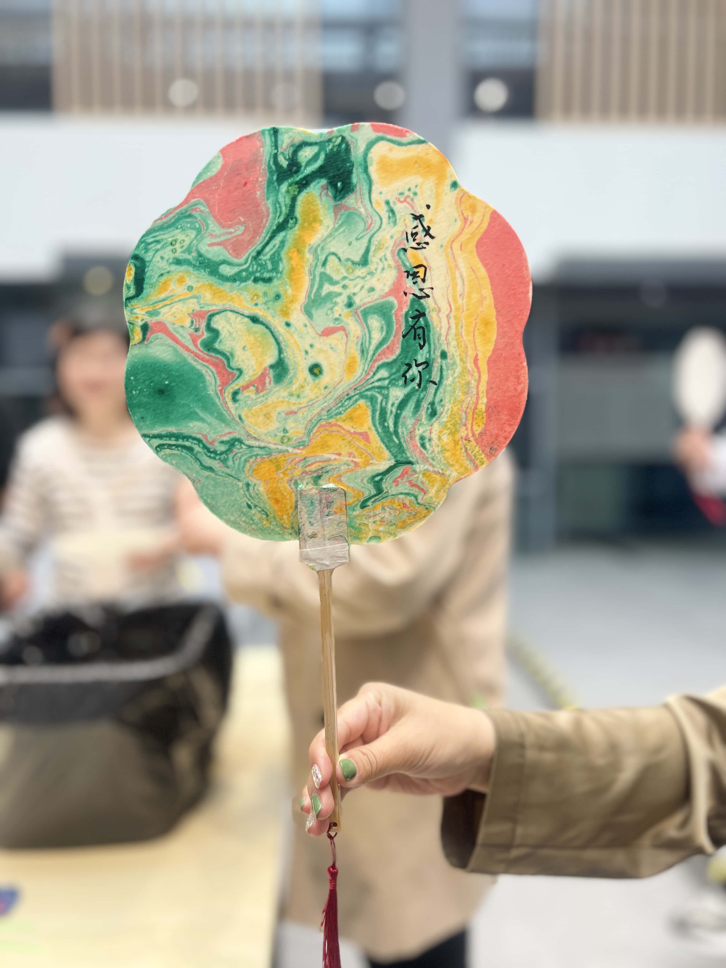 听完漆扇的介绍,大家跃跃欲试,纷纷开始了漆扇的创作。选好自己喜欢的颜色后,滴入水中,轻微搅拌出纹理后,迅速将白色扇面放入水中。抖动、旋转,不同的方式、不同的配色,所有的图案都不一样,绚丽多彩,每一把漆扇都有自己独特的美。