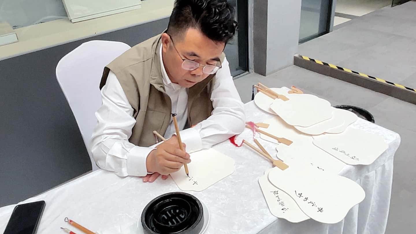 活动开始前,总经理谢洪正亲自提笔,为大家的漆扇题字,增添一份墨香韵味。